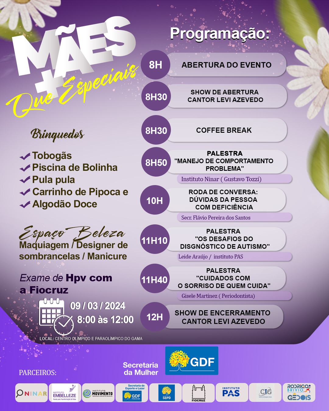 O Centro Olímpico e Paralímpico (COP) do Gama será palco, neste sábado (9), de um evento especial dedicado às mães atípicas. Promovida pela Secretaria da Mulher (SMDF), a ação, gratuita e aberta ao público, faz parte das atividades do calendário Março Mais Mulher, e tem como objetivo oferecer um momento de acolhimento, aprendizado e diversão para essas mães e os filhos delas.