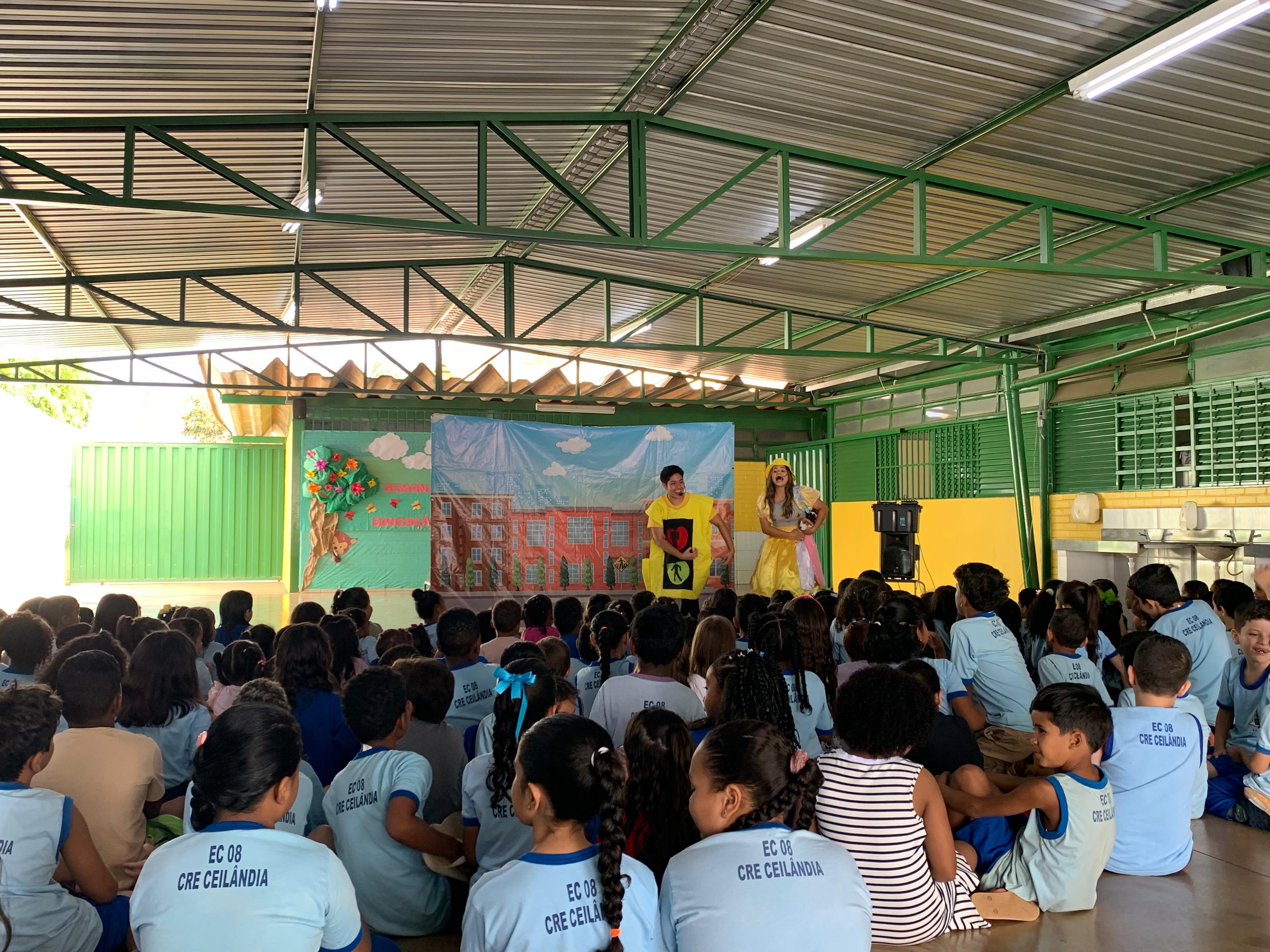 Na Escola Classe 8, em Ceilândia Norte, estudantes de 4 a 10 anos acompanharam, na sexta, seis sessões de espetáculo teatral sobre circulação segura em vias públicas e comportamento adequado em veículos e bicicletas. O público alcançado foi de 300 alunos.