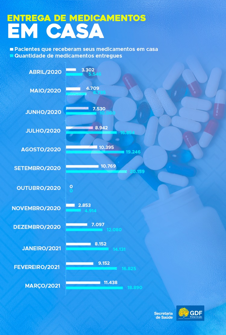 De janeiro a março deste ano, o programa Entrega de Medicamentos em Casa, fruto de parceria entre a Secretaria de Saúde (SES) e o BRB, entregou 48.846 medicamentos de alto custo aos pacientes cadastrados. A iniciativa tem tido sucesso e tornou-se fundamental para o atendimento dos pacientes, principalmente na pandemia de covid-19.
