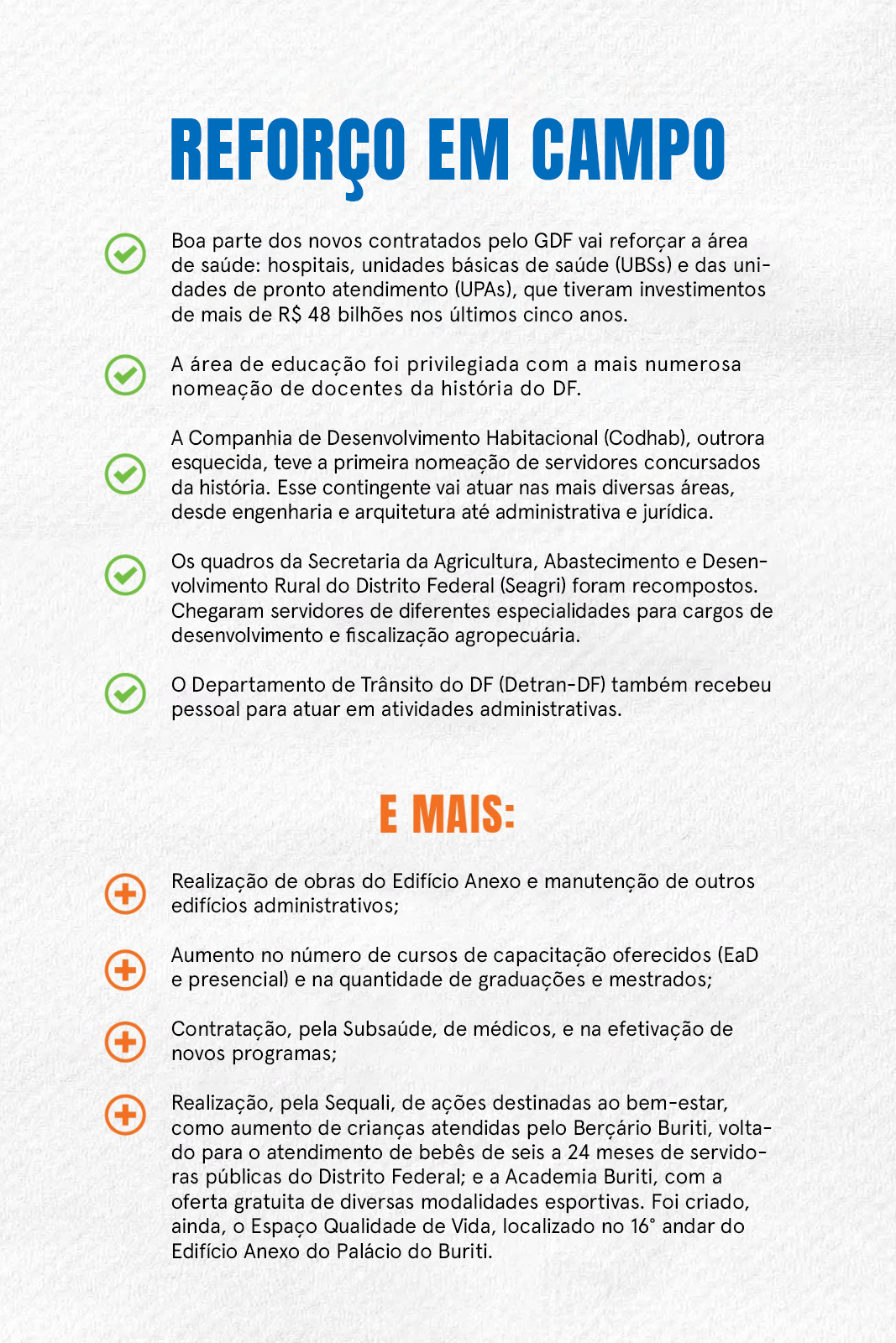 O reforço no estafe de servidores públicos tem como objetivo direto a melhoria do atendimento prestado à população. Mas traz, consigo, outros benefícios: desafoga a jornada dos colaboradores, alivia a pressão sobre os gestores e, consequentemente, amaina o ambiente de trabalho. Por isso, tão comentada foi a nomeação dos 7,8 mil novos profissionais de janeiro a setembro de 2024 pelo governador do DF, Ibaneis Rocha.