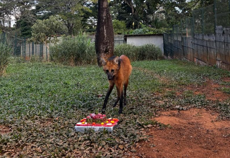 Nesta quinta-feira (22), o Zoológico de Brasília comemora o segundo aniversário da mascote Atena, uma lobo-guará que tem encantado visitantes com sua história de superação. Para celebrar a data, ela ganhou um bolo especial preparado pela equipe da Coordenação de Alimentação e Nutrição Animal da instituição, com ingredientes do jeitinho que ela gosta: ração, frango, carne e frutas.