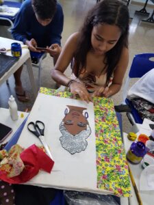 Os adolescentes fizeram pintura em tela ou cartolina, utilizando tintas, tecidos, sementes e papéis coloridos para a composição das imagens