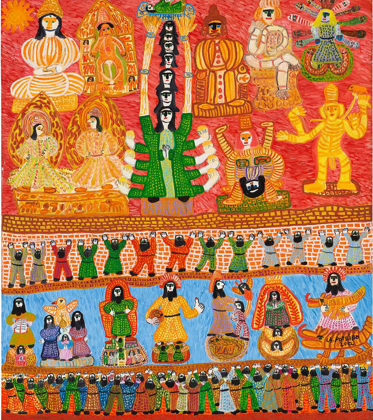 “É uma mistura de barroco com Karajá”, sintetiza o curador, sobre a obra de Antônio Poteiro – que passou a ter esse apelido em 1967, quando mudou-se para Goiânia (GO). Segundo Divino Sobral, o artista conviveu com o povo Iny-Karajá, presente em Goiás, Tocantins, Pará e Mato Grosso, e sofreu influências das esculturas feitas pelos indígenas. Já a influência do barroco vem da obra de Aleijadinho, que Poteiro conheceu de perto nas viagens pelo interior de Minas Gerais. “O imaginário transitou da materialidade do barro para o universo vibrante da cor”, pontua o curador da mostra.