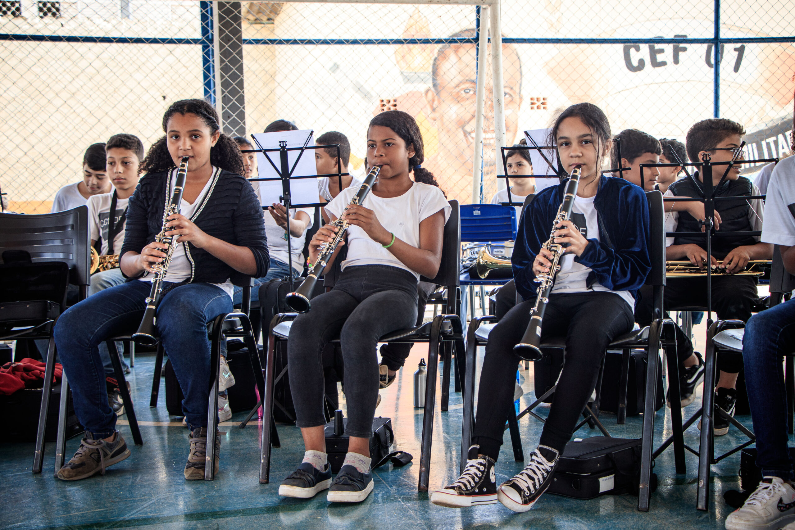 O CEF 1 do Riacho Fundo II é um dos seis colégios de gestão compartilhada do Distrito Federal que participam do projeto Musicalização nas Escolas Cívico-Militares. Desde 1º de agosto, 480 alunos têm aprendido a tocar um instrumento no contraturno escolar. São três aulas por semana, cada uma delas com três horas de duração, todas ministradas por músicos da reserva militar do Corpo de Bombeiros (CBMDF).
