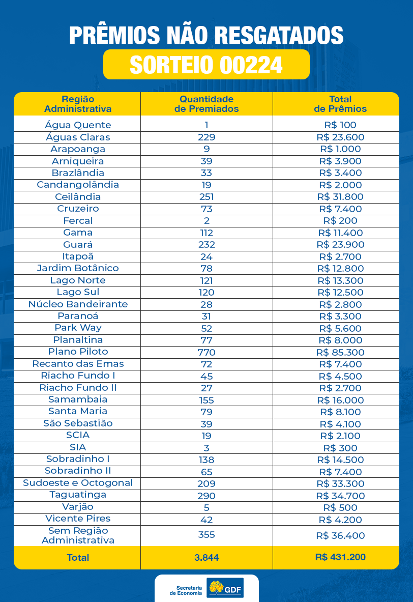 A maior quantidade de bilhetes pendentes é de moradores do Plano Piloto, com 770 prêmios, que somam mais de R$ 85,3 mil. Em seguida, está Taguatinga, com 290 tíquetes premiados, totalizando R$ 34,7 mil. Já o Sudoeste/Octogonal concentra 209 bilhetes, correspondentes a R$ 33,3 mil. Há ainda 355 cupons sem região administrativa identificada, que acumulam R$ 36,4 mil em prêmios.
