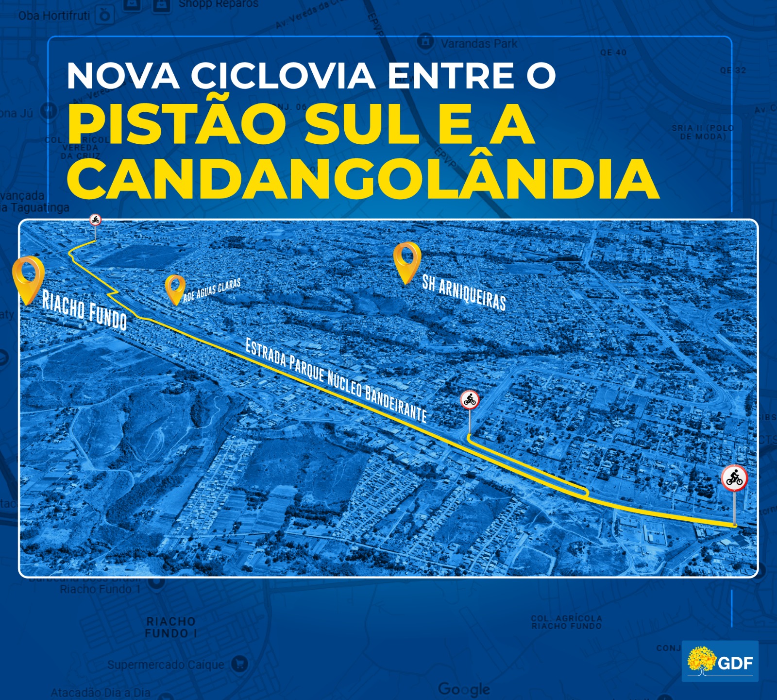 O Governo do Distrito Federal (GDF) deu início à construção de uma nova ciclovia interligando o Pistão Sul, em Taguatinga, à Candangolândia, passando por Riacho Fundo, Arniqueira e Núcleo Bandeirante. A primeira fase da obra contempla um trecho de 9 km de extensão e conta com investimento de R$ 2 milhões.