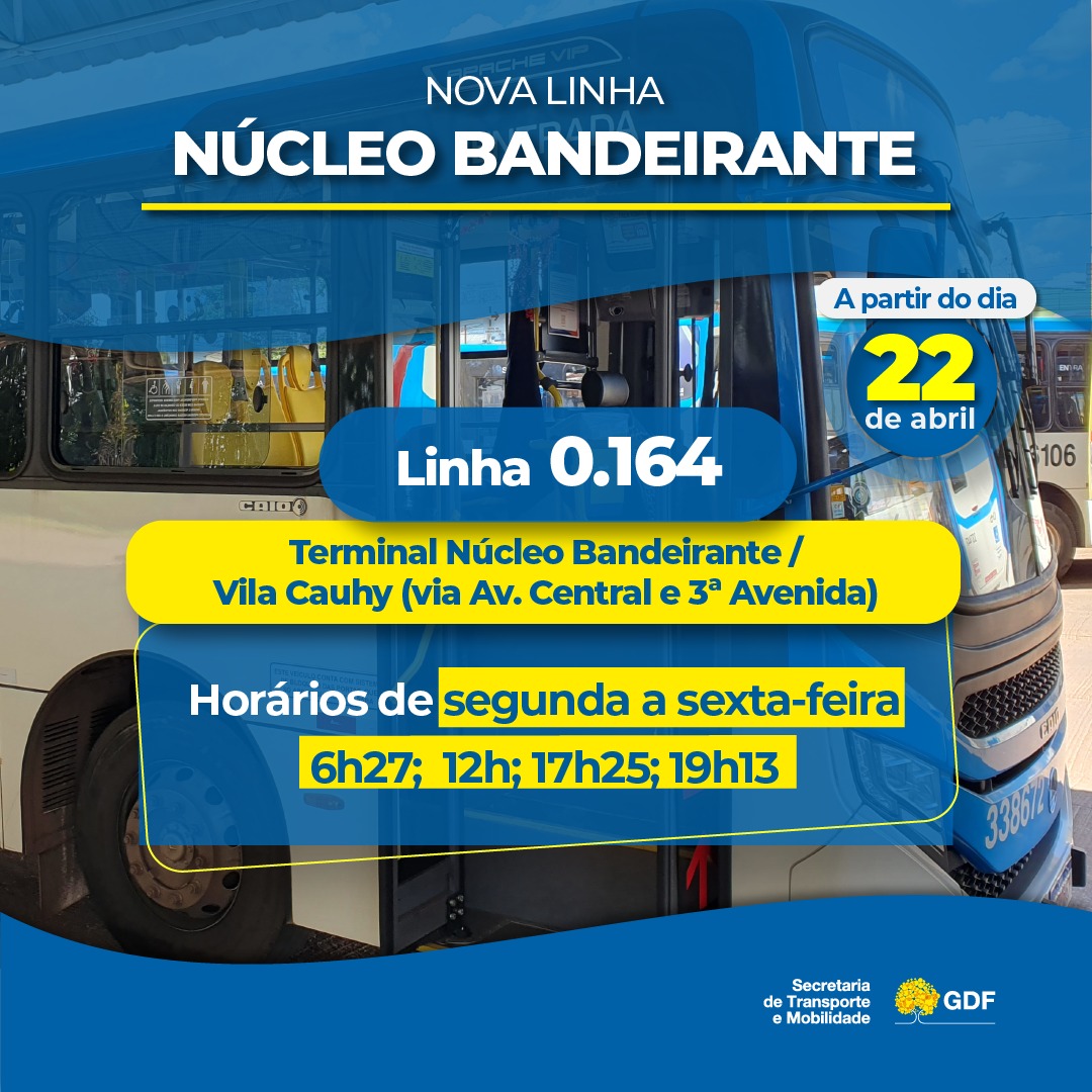 Os moradores da Vila Cauhy vão ter acesso à nova linha de ônibus 0.164 a partir desta segunda-feira (22). O serviço vai fazer percurso circular entre o terminal do Núcleo Bandeirante e a localidade, com tarifa de R$ 2,70.