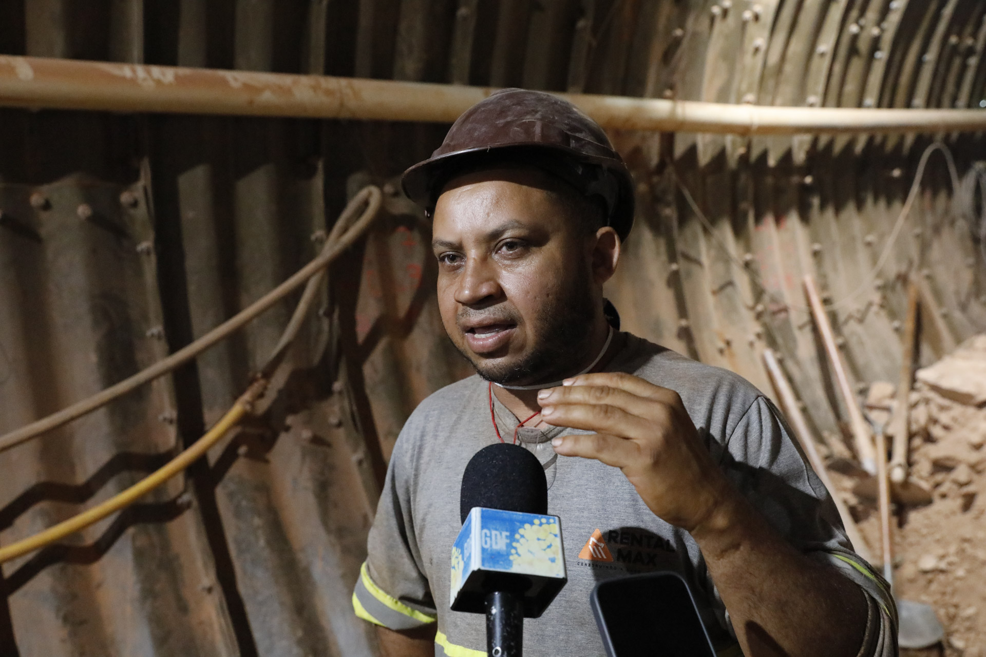 “É um túnel com um pouco mais de três metros de diâmetro e que comporta a utilização dessa máquina. Mas, por se tratar de um equipamento pesado, foi preciso utilizar um guincho para descê-la por meio dos nossos poços verticais. A escavadeira desceu desmontada e foi montada aqui dentro, onde ela consegue caminhar e executar sua função”, completa o diretor da Terracap.