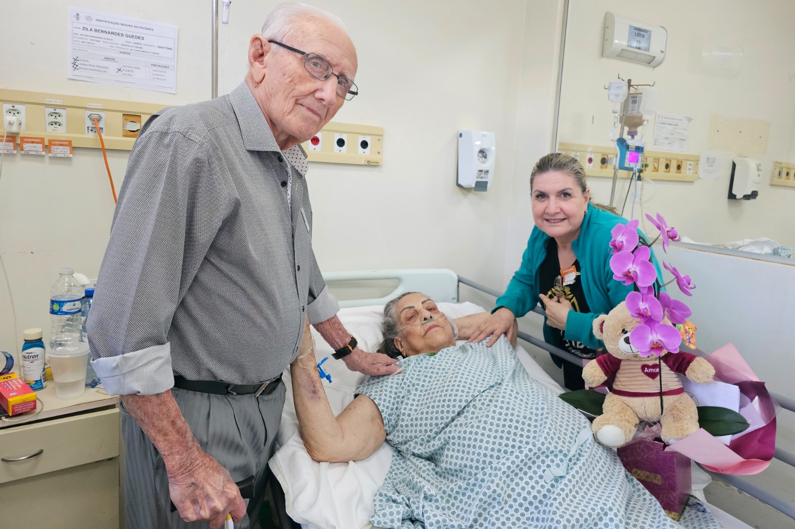 Um gesto de amor, carinho e delicadeza emocionou a paciente Zilá Guedes, internada na enfermaria da clínica médica do Hospital Regional de Santa Maria (HRSM). Nesta quinta-feira (1º), ela completou 80 anos, e seu esposo, Otávio Guedes, 93, fez questão de levar flores de presente de aniversário para sua amada, com quem é casado há 63 anos.
