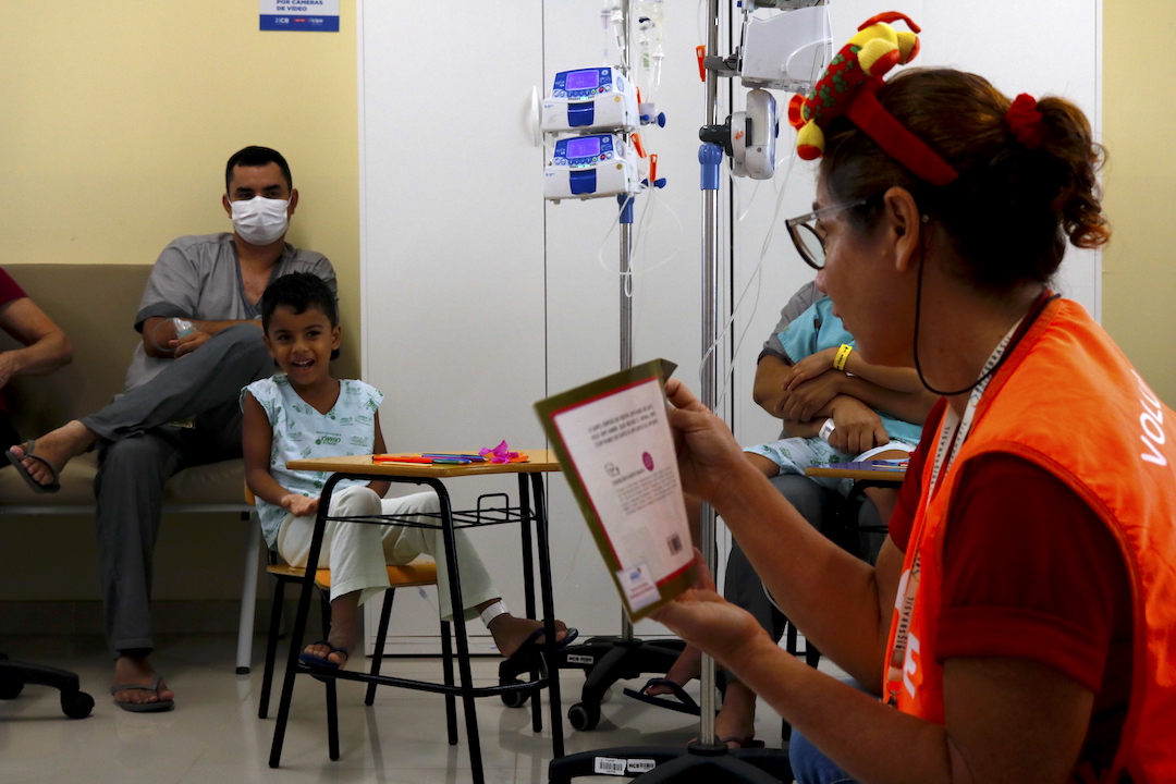 As crianças internadas no Setor de Oncologia do Hospital da Criança de Brasília José Alencar (HCB) desfrutaram de uma tarde descontraída na quarta-feira (7). Voluntários da Associação Brasileira de Assistência às Famílias de Crianças Portadoras de Câncer e Hemopatias (Abrace) alegraram o dia de meninos e meninas em um evento que reuniu histórias, música e artes plásticas.
