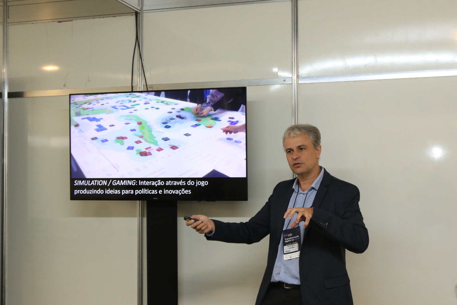 Em palestra na 6ª Feira de Soluções para a Saúde, o pesquisador do Centro de Desenvolvimento Tecnológico em Saúde (CDTS) da Fiocruz Marcelo Vasconcellos abordou o uso de jogos virtuais para retardamento do Alzheimer e para reabilitação de amputados, entre outras aplicações | Foto: Sandro Araújo/Agência Saúde-DF