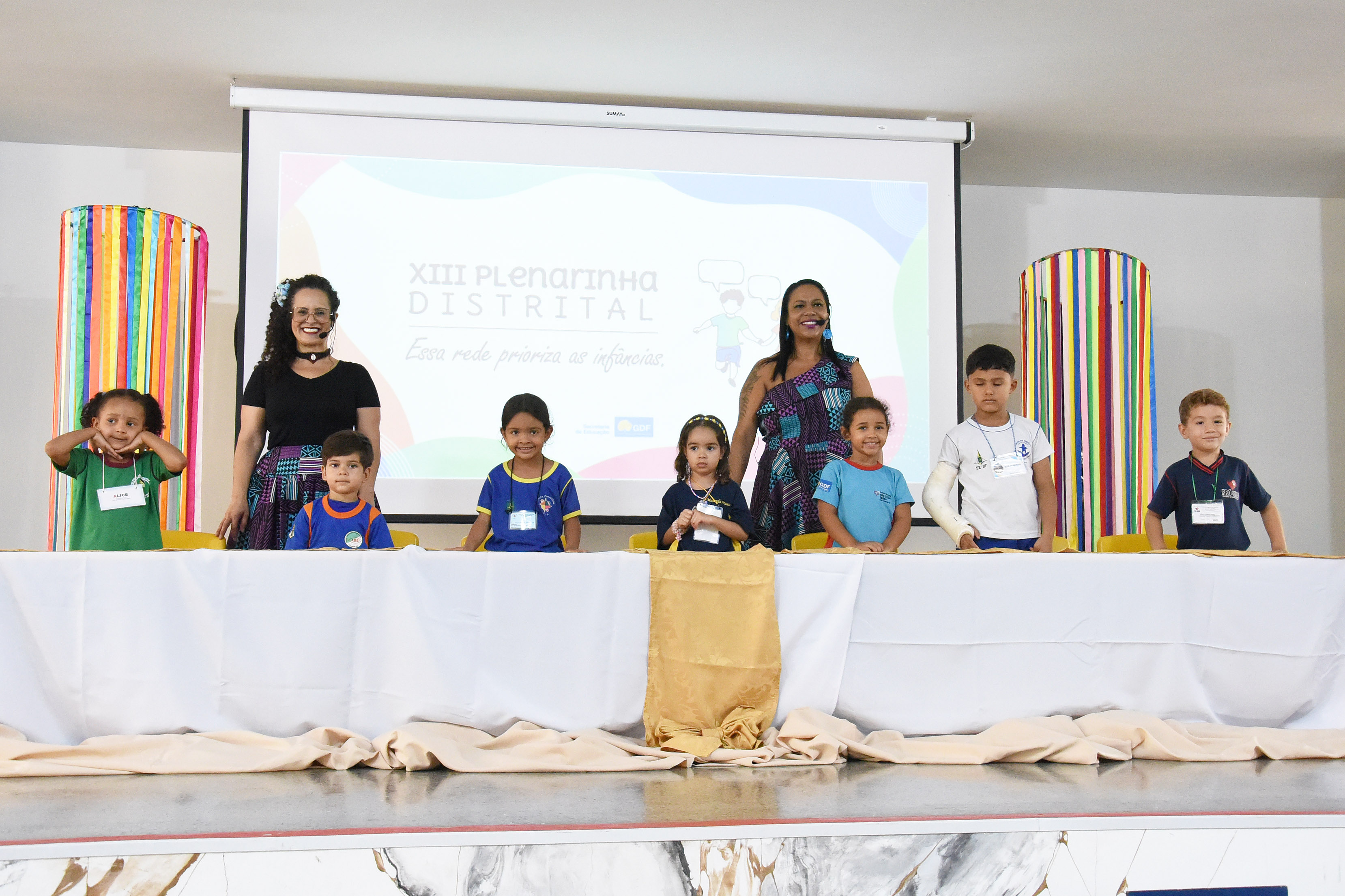 Durante a abertura, estudantes das coordenações regionais de ensino do Núcleo Bandeirante, Taguatinga, Sobradinho, Santa Maria, São Sebastião e Samambaia compuseram simbolicamente a mesa, representando a diversidade da rede pública e a força da infância como agente de transformação social.