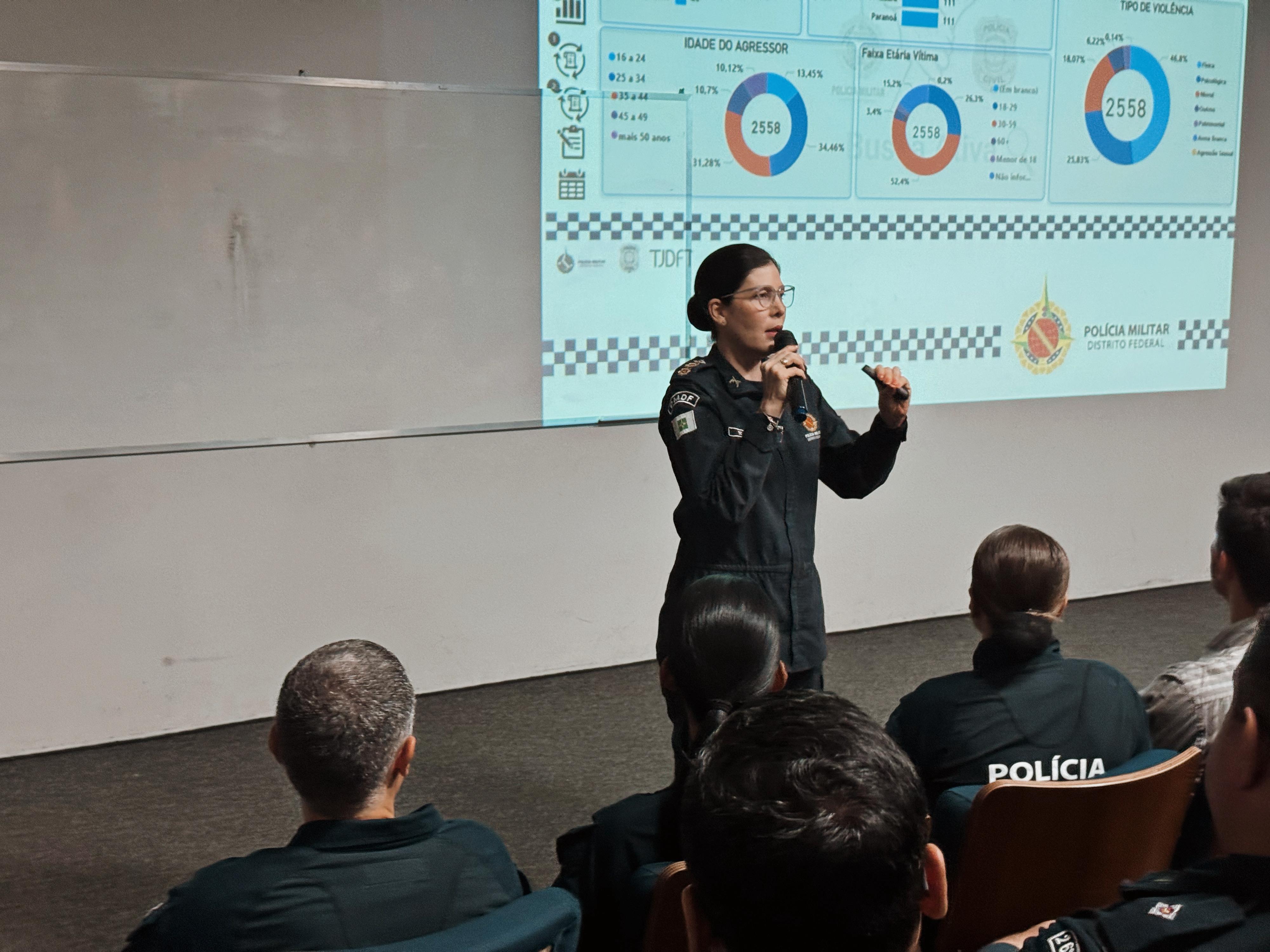 Na tarde desta quinta-feira (31/7), a Polícia Militar do Distrito Federal (PMDF) promoveu uma palestra com tenentes que concorrem ao cargo de coordenador de planejamento urbano (CPU). O encontro teve como objetivo apresentar procedimentos e normas relativas a ocorrências de violência contra mulher, conceitos e requisitos para o correto registro e homologação de ocorrências relacionadas à violência doméstica e familiar contra a mulher, em alinhamento com os protocolos estabelecidos pela operação Shamar.