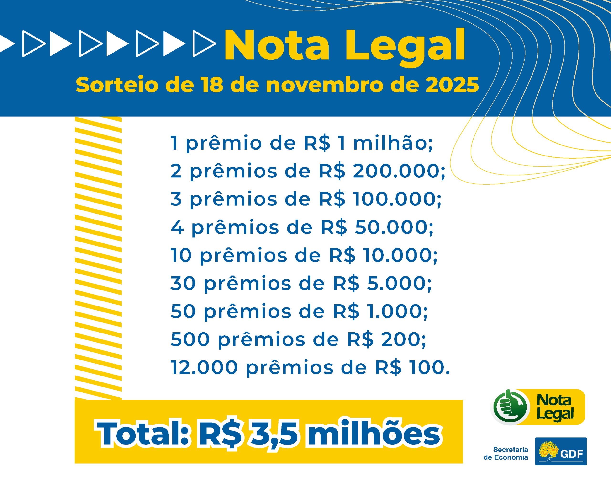 O consumidor que costuma exigir a inclusão do CPF nas notas fiscais e que tenha débitos com a Secretaria de Economia (Seec-DF) tem até a terça-feira (9) para regularizar a situação e, assim, garantir a participação no segundo sorteio de 2025 do Nota Legal. Programado para 18 de novembro, o concurso distribuirá R$ 3,5 milhões em prêmios — sendo o principal de R$ 1 milhão.