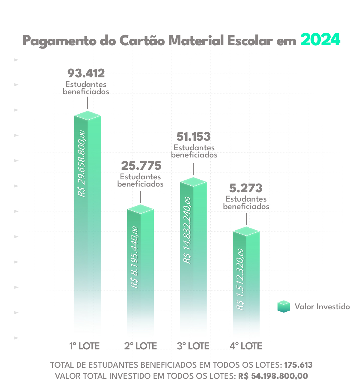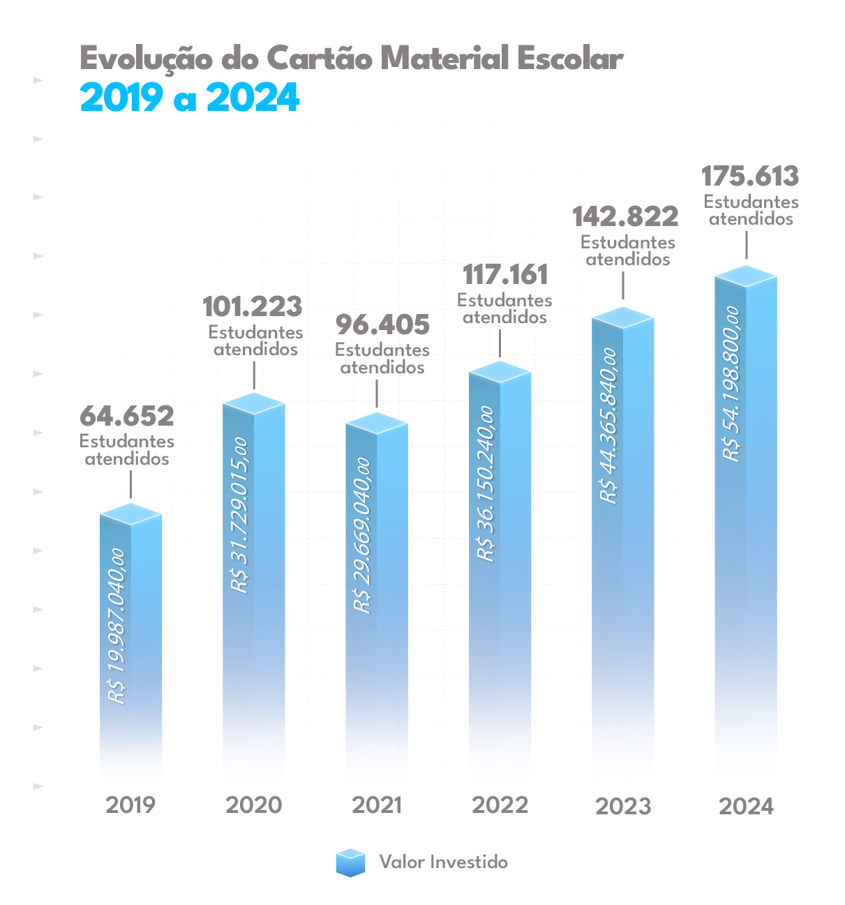 O Cartão Material Escolar é uma iniciativa para auxiliar financeiramente famílias de baixa renda que sejam beneficiárias do programa do governo federal, Bolsa Família, no custeio de materiais essenciais para a educação dos estudantes de 4 a 17 anos. Os dados a seguir mostram o crescimento exponencial de quantidades de estudantes atendidos e o total investido de 2019 a 2024. Confira: