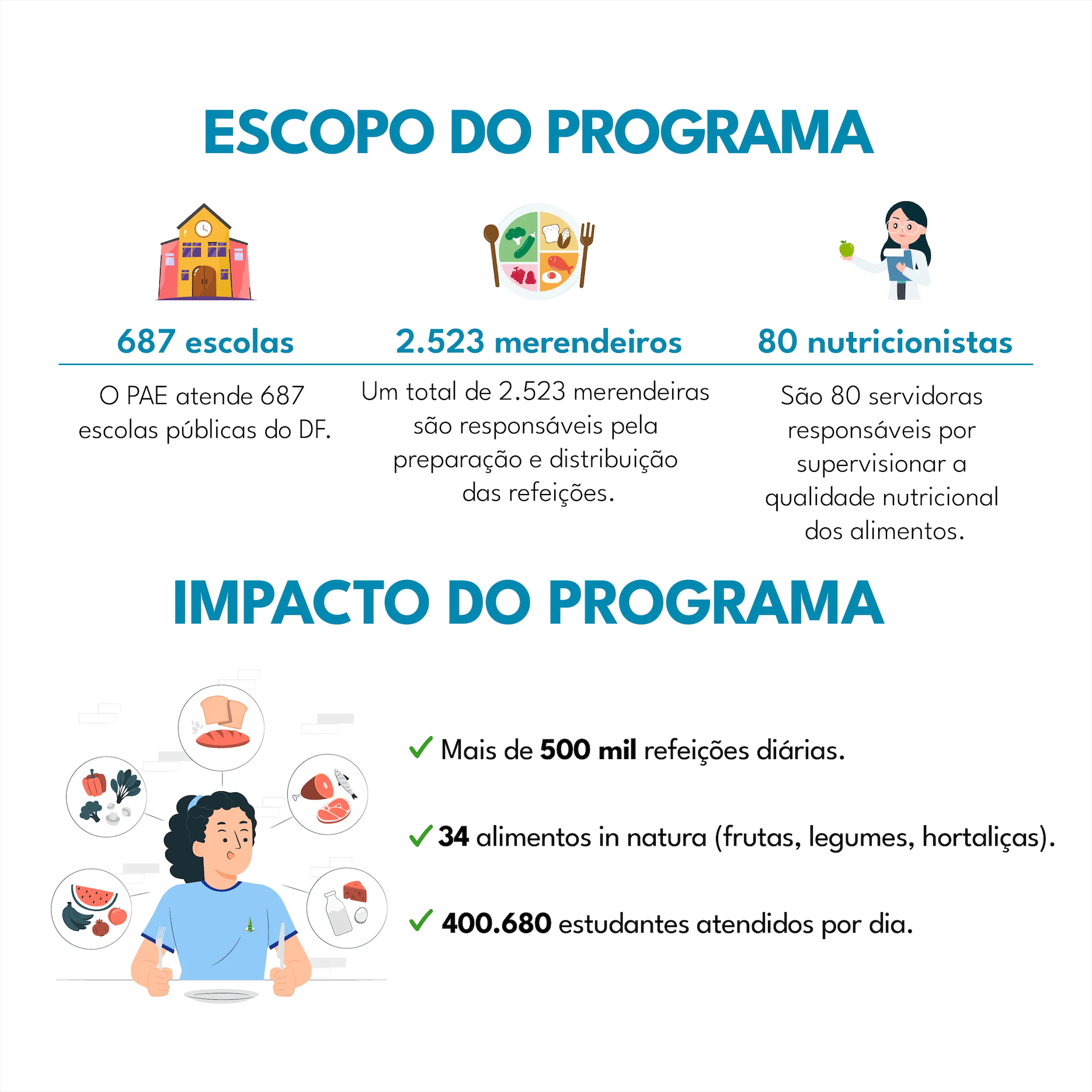 O relatório do Diagnóstico do Programa de Alimentação Escolar (PAE-DF) revelou dados que reforçam a importância da modernização. Atualmente, o programa atende mais de 400 mil estudantes em 697 escolas públicas, servindo 500 mil refeições diariamente, incluindo 34 alimentos in natura, com o trabalho de 2.523 merendeiros e aproximadamente 80 nutricionistas responsáveis pela supervisão e planejamento.