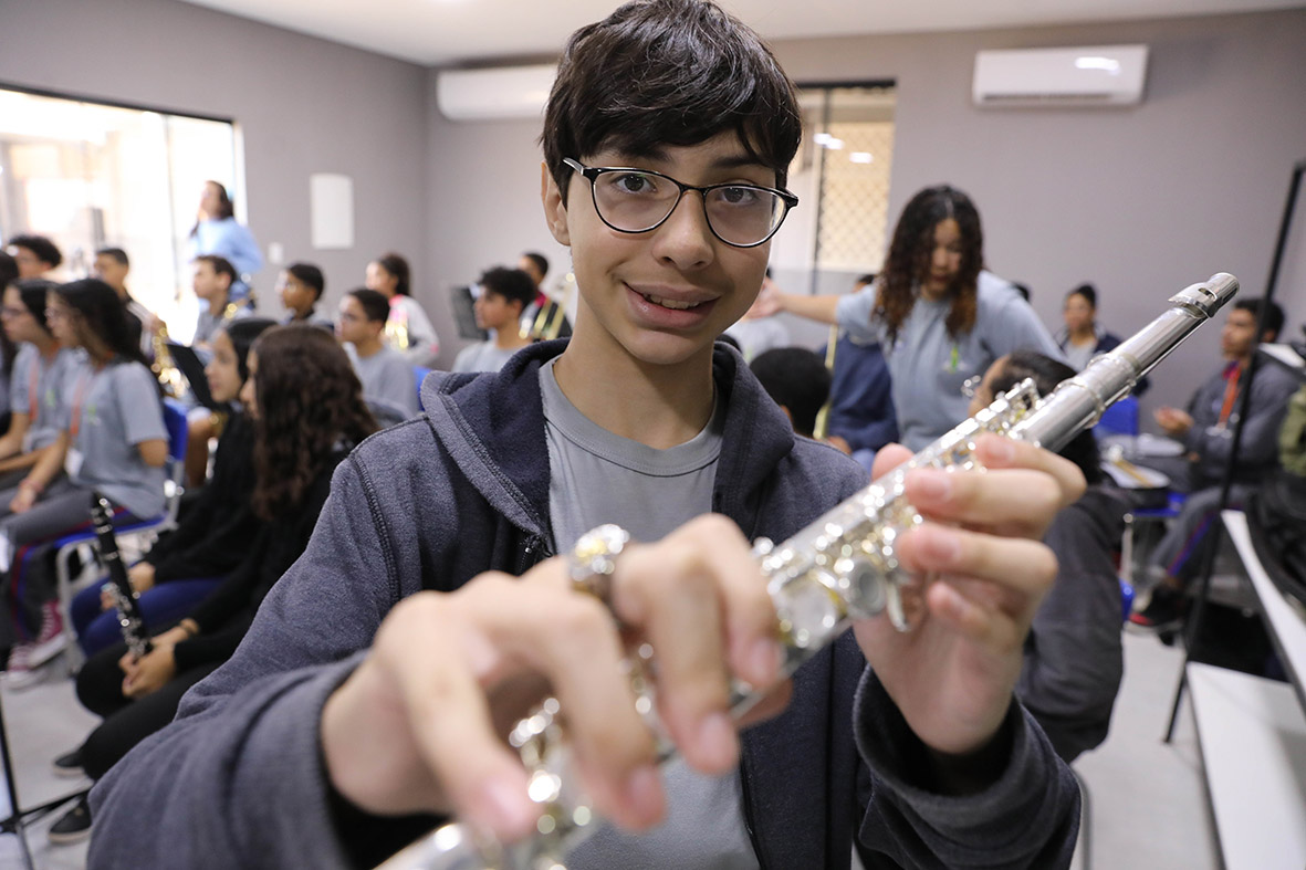 O processo de escolha é feito de forma orientada. Os instrumentos são apresentados, e cada estudante pode se identificar com algum deles. A equipe sempre avalia se o aluno tem aptidão – no caso da clarineta, por exemplo, primeiro testam a boquilha e a palheta antes de montar o instrumento completo. Se um estudante não se adapta, é direcionado para outro instrumento até encontrar aquele em que melhor se encaixa. “Eles escolhem, sim, mas nós também orientamos para que encontrem o caminho certo”, aponta o coordenador.