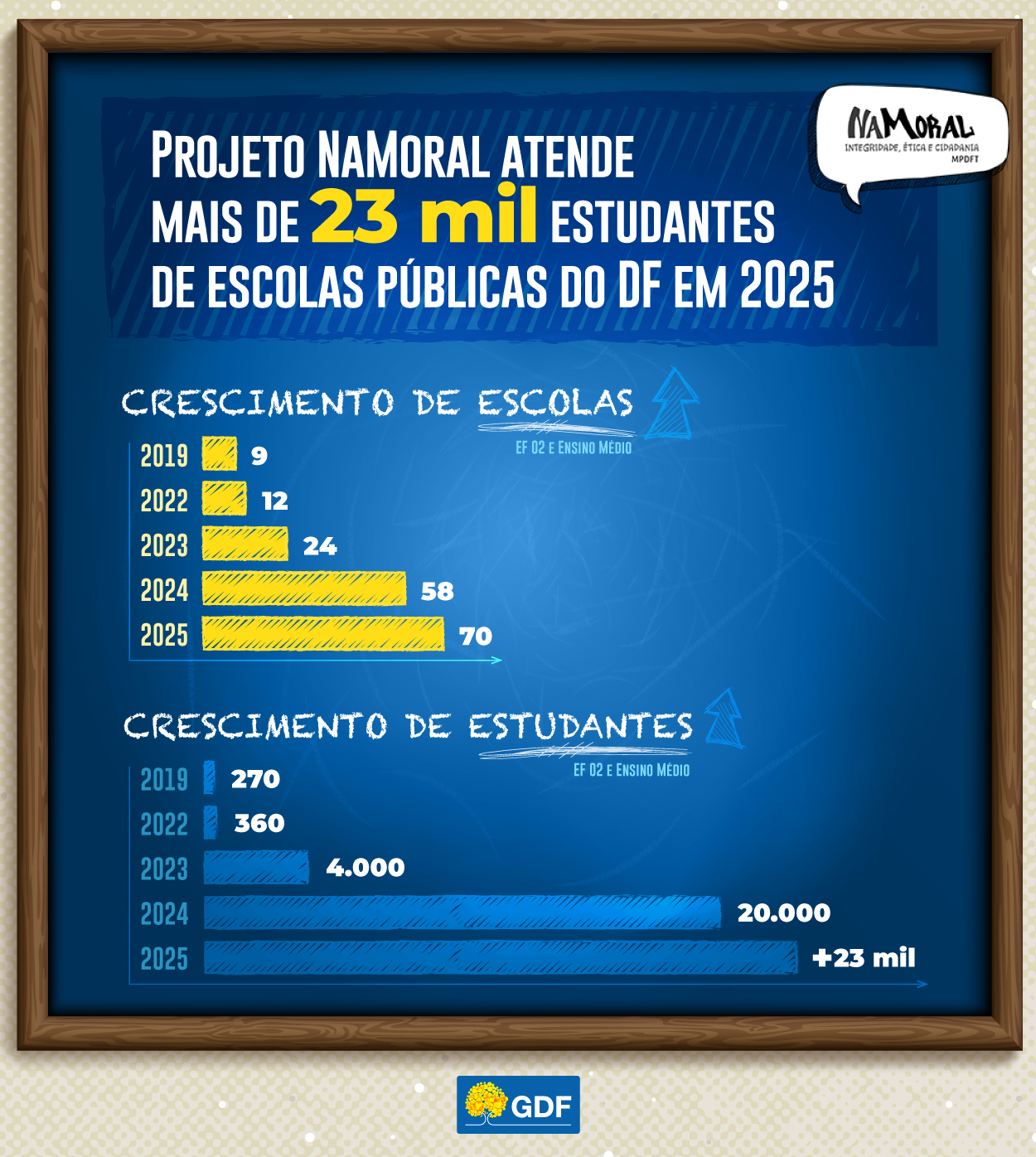 Os pilares de integridade e ética têm feito diferença na vida de mais de 23 mil estudantes das escolas públicas do Distrito Federal atendidas pelo projeto NaMoral. Em constante expansão desde 2019, quando foi lançada, a parceria entre a Secretaria de Educação (SEEDF) e o Ministério Público do Distrito Federal e Territórios (MPDFT) alcançou neste ano a marca de 70 unidades atendidas em todo o DF, com o objetivo de fortalecer a cultura de paz dentro das escolas. O número é 20% maior que o contabilizado no ano passado, quando havia 58 escolas contempladas.