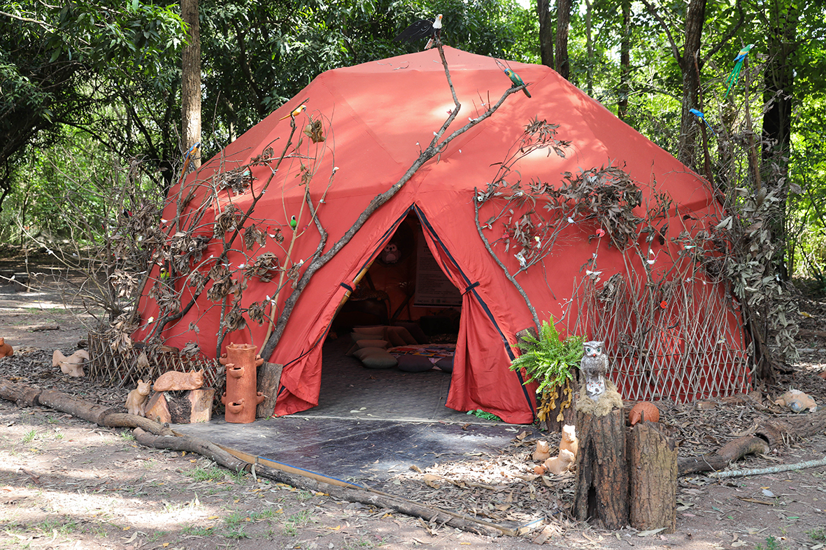 Entre as árvores e a vegetação nativa, um cantinho aconchegante se destaca no Parque Ecológico Saburo Onoyama, em Taguatinga. A estrutura oval, coberta por um tecido vermelho, é repleta de elementos do Cerrado – desde o conteúdo dos livros, pelúcias e almofadas que compõem a área interna até as esculturas que cercam o lado de fora, parecendo uma tenda encantada. É a terceira edição do projeto Toca Literária do Cerrado, lançada oficialmente nesta sexta-feira (30), que ficará no local até o dia 8 de junho, com oficinas de mediação literária e arte, rodas de leitura e vivências com passeios guiados pelo Cerrado.