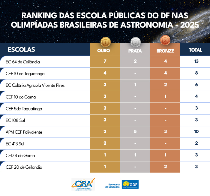 Na recente 28ª Olimpíada Brasileira de Astronomia e Astronáutica (OBA), a rede pública de ensino do Distrito Federal alcançou um recorde com 34 medalhas de ouro, quatro a mais que em 2024, e um total de 87 premiações em todas as edições da competição. O desempenho consagra alunos do ensino fundamental e médio com destaque nacional e marca o melhor resultado das escolas públicas do DF.