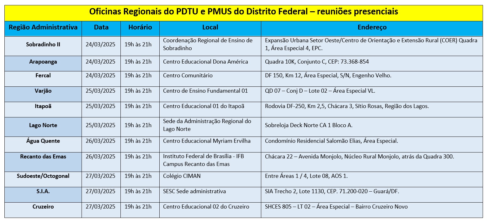 A Secretaria de Transporte e Mobilidade (Semob-DF) encerrou, na noite de quinta-feira (13), a primeira semana de debates sobre o Plano Diretor de Transporte Urbano (PDTU) e o Plano de Mobilidade Urbana Sustentável (PMUS) do Distrito Federal. Até o momento foram realizadas oficinas de diagnóstico em 12 cidades. Os eventos serão retomados no próximo dia 24, devendo percorrer todas as regiões administrativas até o mês de abril.