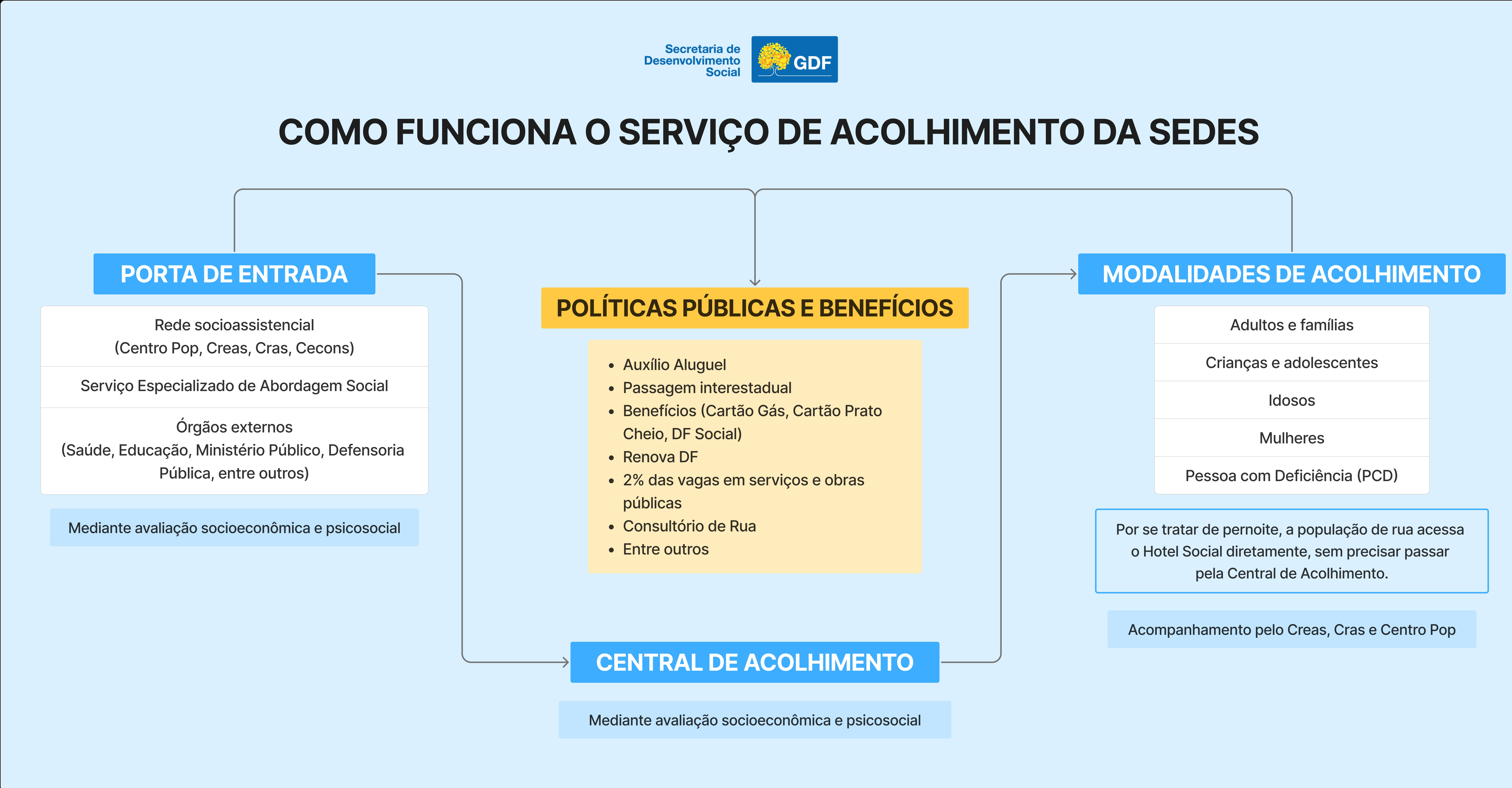 O Centro de Referência para a População de Rua (Centro Pop) não faz parte do serviço de acolhimento institucional do GDF. É uma unidade da Sedes-DF que serve de ponto de apoio para esse público, que funciona somente durante o dia e onde as pessoas em situação de rua recebem atendimento socioassistencial, podendo guardar os pertences, tomar banho, emitir documentos pessoais, ter acesso a benefícios e ser encaminhadas para políticas da assistência social, como o serviço de acolhimento institucional, e de outras áreas, como saúde e emprego e renda. O DF tem dois centros Pop - um na Asa Sul e outro em Taguatinga.