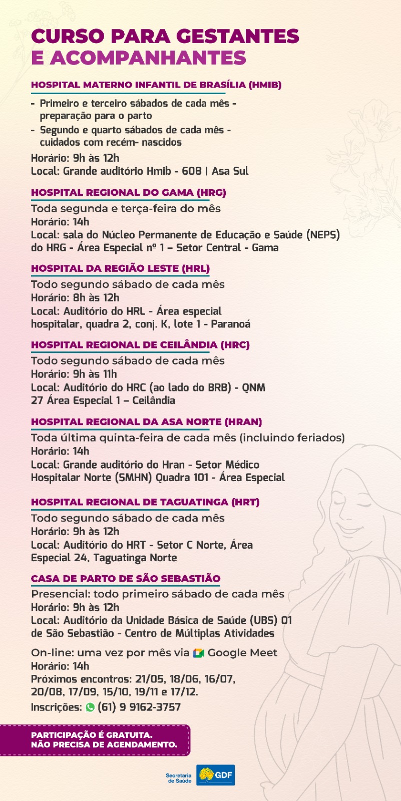 A Secretaria de Saúde (SES-DF) disponibiliza cursos e atividades para preparar mães e pais para a chegada do bebê. As orientações ajudam a sanar dúvidas sobre o parto e os cuidados com o recém-nascido. As unidades que oferecem esses serviços são: Hospital Regional do Gama (HRG), Hospital da Região Leste (HRL), Hospital Regional de Taguatinga (HRT), Hospital Regional de Ceilândia (HRC), Hospital Regional da Asa Norte (Hran), Casa de Parto de São Sebastião e Hospital Materno Infantil de Brasília (Hmib).
