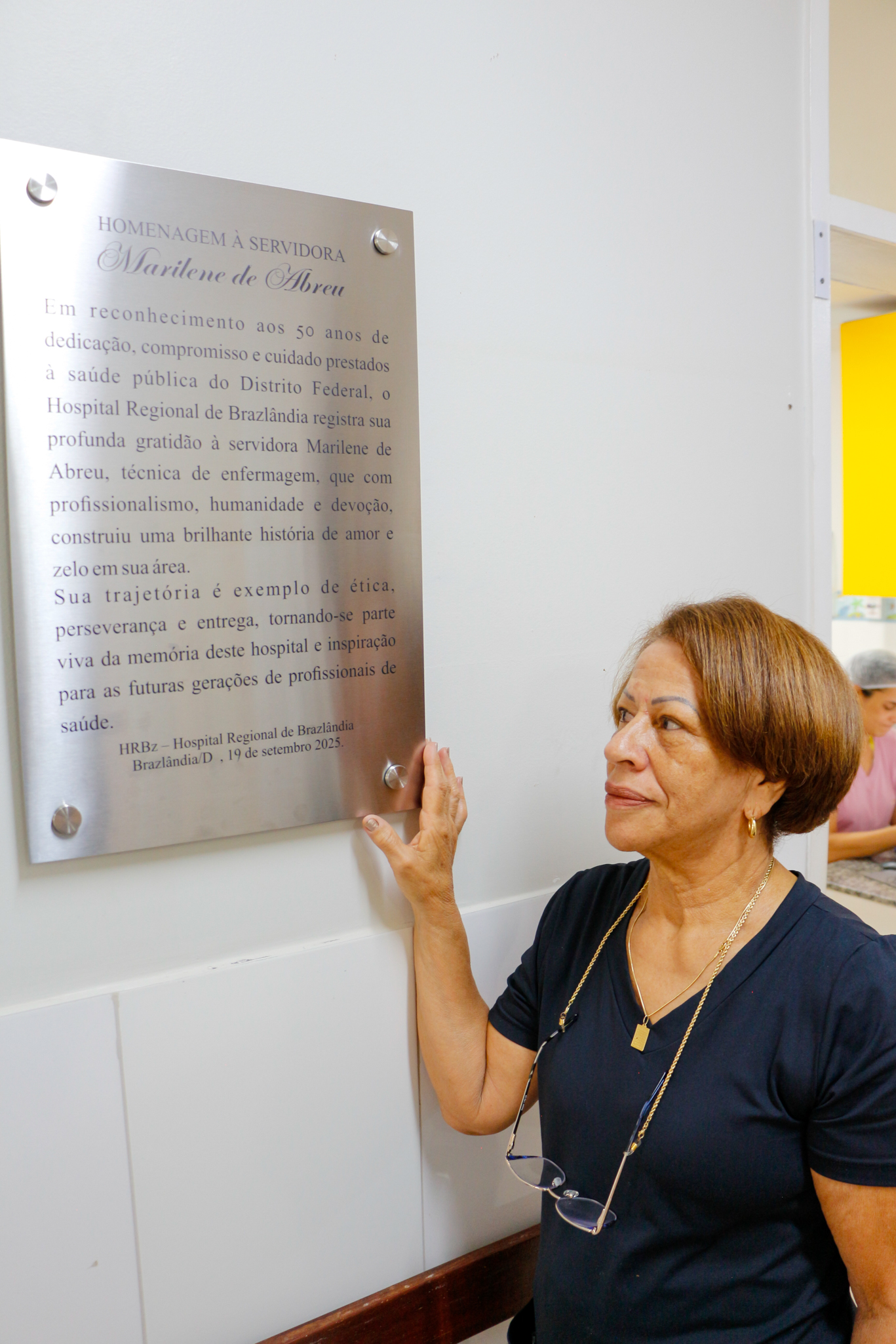 Quando Marilene completou 50 anos de serviços prestados à população de Brazlândia, em setembro, os servidores do HRBz organizaram uma festa de comemoração. Fizeram uma vaquinha, mandaram confeccionar uma placa de homenagem e encomendaram uma joia dedicada à servidora, como lembrança dos amigos do hospital. Marilene afirma que são muitas as memórias do local, formadas ao longo de cinco décadas — além dos inúmeros pacientes, foi também no HRBz que nasceram seus três filhos e, mais tarde, seus sete netos.