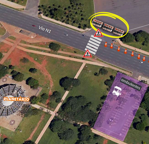 Na via N1, na altura do Planetário, e na via contorno do estádio, os agentes de trânsito implantarão sinalização viária para a travessia de pedestres e para impedir estacionamento irregular. O estacionamento do Planetário será destinado aos vendedores ambulantes.
