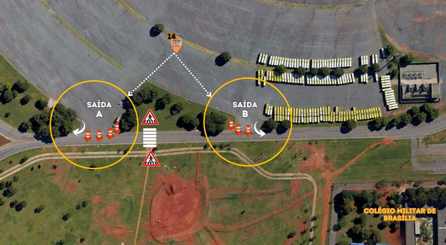 Durante a dispersão, a partir das 22h, na altura do estacionamento rotativo, os veículos da saída “A” serão direcionados para a Via N1. Já os veículos oriundos da saída “B” seguirão no sentido Colégio Militar. O Detran-DF implantará sinalização para canalizar o fluxo de veículos em sentido único. Para isso, a rotatória da Curva do Chinelo, próxima ao Complexo Aquático Cláudio Coutinho, ficará bloqueada.