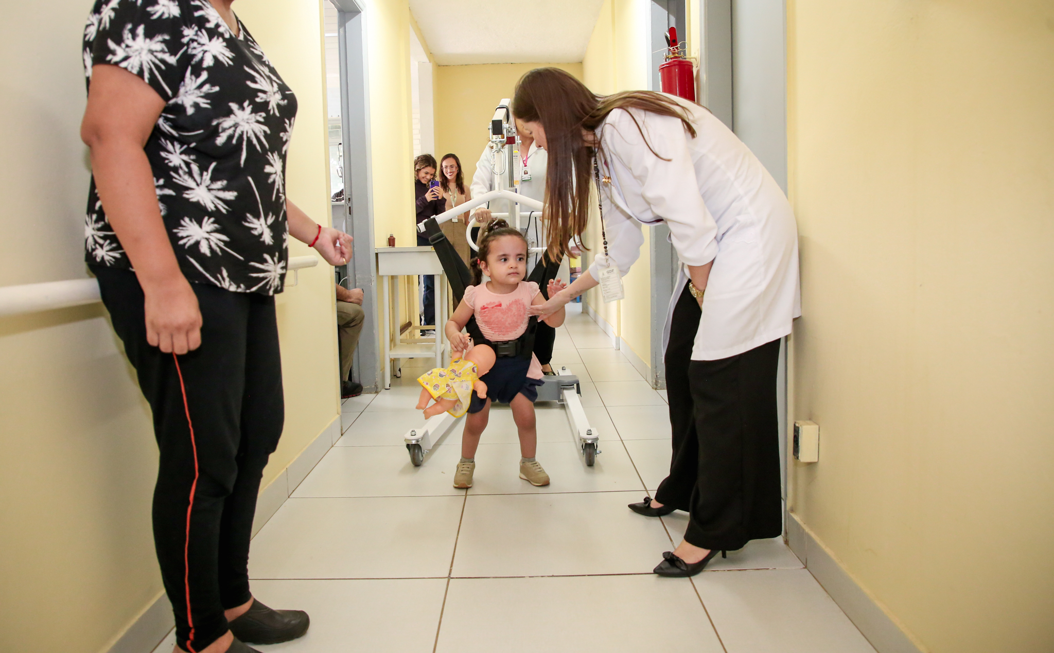 Maitê Garcia foi uma das primeiras crianças a usar o suspensório e os resultados foram positivos: em poucos dias, conseguiu dar os primeiros passos sem apoio | Fotos: Ualisson Noronha/Agência Saúde DF