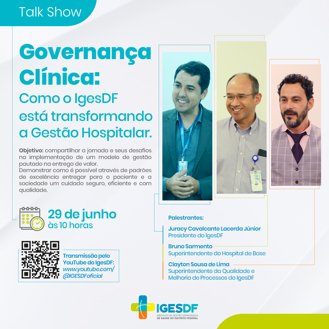 O talk show, que será transmitido no canal no YouTube do IgesDF, tem como palestrantes o diretor-presidente do IgesDF, Juracy Cavalcante; o superintendente do Hospital de Base, Bruno Sarmento; e o superintendente da Qualidade e Melhoria de Processos do IgesDF, Clayton Sousa de Lima. “Queremos que a população compreenda o que é governança clínica, as razões que nos levaram a escolher esta proposta como estratégia para o modelo de gestão do IgesDF e sua amplitude no que diz respeito à gestão hospitalar”, explica o diretor-presidente do instituto.