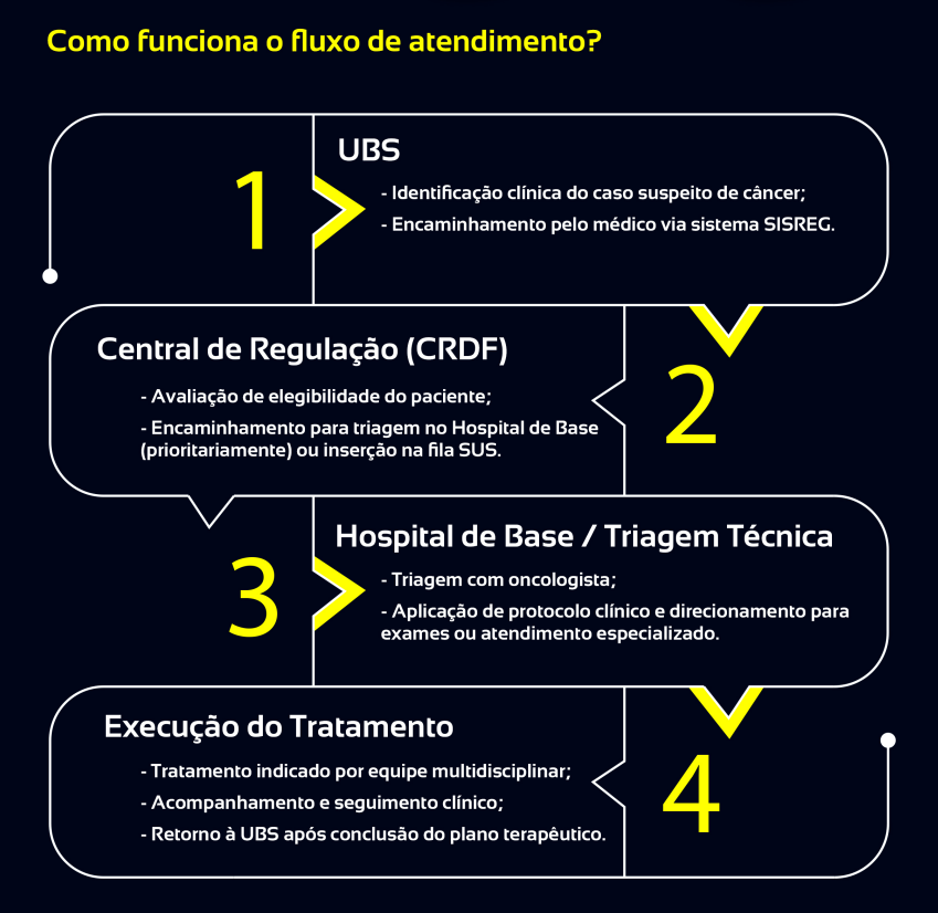 Após inserido na fila de regulação para primeira consulta oncológica, o paciente é acionado pela Central de Regulação do Distrito Federal, onde passa por uma triagem oncológica. Em seguida, ele pode começar o tratamento em alguma das unidades habilitadas. Tudo isso com acompanhamento contínuo e posterior retorno à UBS, conforme a evolução clínica. A equipe especializada monitora o paciente em todas as etapas: exame, cirurgia, quimioterapia e radioterapia.
