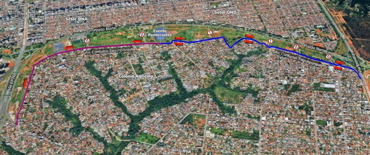 Na região do Taguaparque e de Vicente Pires, durante a saída do evento, o fluxo de veículos na Avenida Contorno do Parque, iniciando próximo ao Ginásio de Esportes, estará com sentido único na direção da EPTG e em sentido duplo na direção da via Estrutural.