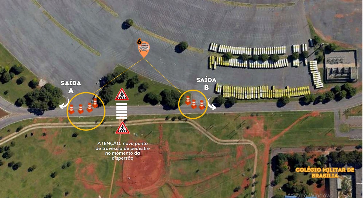 As ações de dispersão terão início a partir das 2h de domingo. No estacionamento rotativo, veículos da saída A serão direcionados para a via N1, enquanto os da saída B seguirão em direção ao Colégio Militar. O Detran-DF instalará sinalização para canalizar o fluxo em sentido único, e, para isso, a rotatória da Curva do Chinelo, próxima ao Complexo Aquático Cláudio Coutinho, ficará bloqueada.