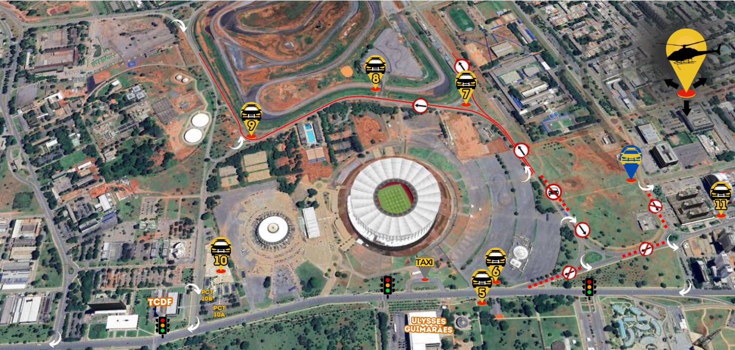 Na via N1, na altura do Planetário, e na via de contorno do Estádio Nacional de Brasília (ENB), os agentes implantarão sinalização para travessia de pedestres e para coibir estacionamento irregular. Na via N2, na altura da rotatória de acesso à via de contorno do ENB, será delimitada uma área de embarque para veículos de aplicativo. Já na entrada principal da Arena BRB será sinalizado espaço para táxis. O estacionamento do Planetário será reservado aos vendedores ambulantes.