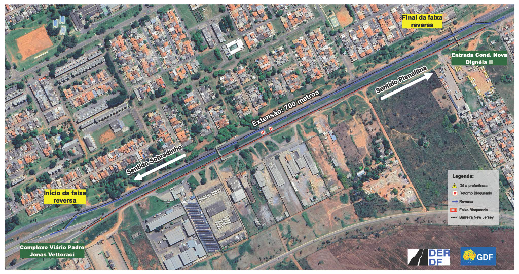 A ação temporária ocorrerá no trecho entre o Viaduto do Complexo Viário Padre Jonas Vettoraci, no km 9,44, e a passarela localizada no km 10,14, com a criação de uma faixa reversa no sentido Sobradinho–Planaltina. Mais de 70 mil motoristas trafegam pelo trecho.