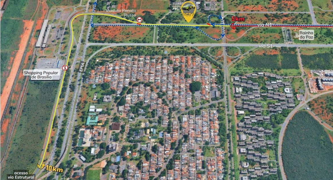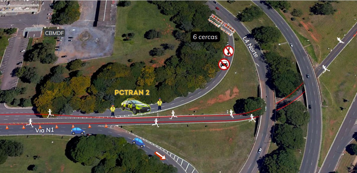 Na via N1, o bloqueio ocorrerá desde o quartel do Corpo de Bombeiros Militar (CBMDF) até a altura da L2 Norte. Os acessos à N1, pela via Palácio Presidencial e pela L4 Norte ficarão fechados. Na N1, a faixa mais à direita, a partir do quartel do CBMDF, será destinada à saída de veículos de emergência. As demais faixas serão utilizadas pelos participantes do evento. As equipes do Detran-DF também farão a interdição de duas faixas na via Palácio Presidencial até a altura do Palácio do Jaburu.