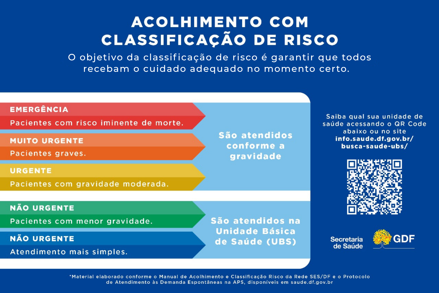 Segundo Damasceno, há um desafio diário na rede pública, uma vez que parte da população tem o hábito de procurar as unidades de alta complexidade ao perceber qualquer tipo de queixa de saúde. Mas, seja nas 13 Unidades de Pronto Atendimento (UPAs), no Hospital de Base (HBDF), no Hospital Materno-Infantil de Brasília (Hmib) ou nos 11 hospitais regionais, os pacientes são classificados de acordo com o risco: azul, verde, amarelo, laranja ou vermelho. As cores indicam, em ordem crescente, a prioridade para a assistência ao indivíduo, definida de acordo com a gravidade apresentada.