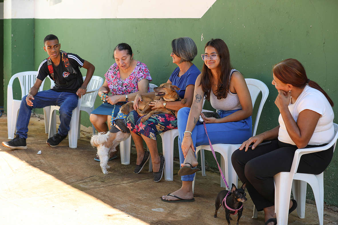“É bem melhor trazer aqui, ainda mais porque exame e consulta estão muito caros”, diz a estudante Maria Eduarda Ribeiro (segunda à esquerda), que levou a pinscher Julie para ser atendida