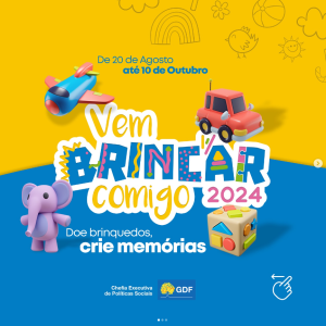 Começou no último dia 20 a campanha Vem Brincar Comigo 2024. Idealizada pela primeira-dama do Distrito Federal, Mayara Noronha Rocha, a mobilização arrecada brinquedos doados para crianças em situação de vulnerabilidade e organiza ações para viabilizar momentos de diversão e lazer aos pequenos. Nesta quinta edição, parte dos brinquedos arrecadados será entregue a unidades socioassistenciais da Secretaria de Desenvolvimento Social (Sedes-DF) que tem brinquedoteca, como os Centros de Referência de Assistência Social (Cras).