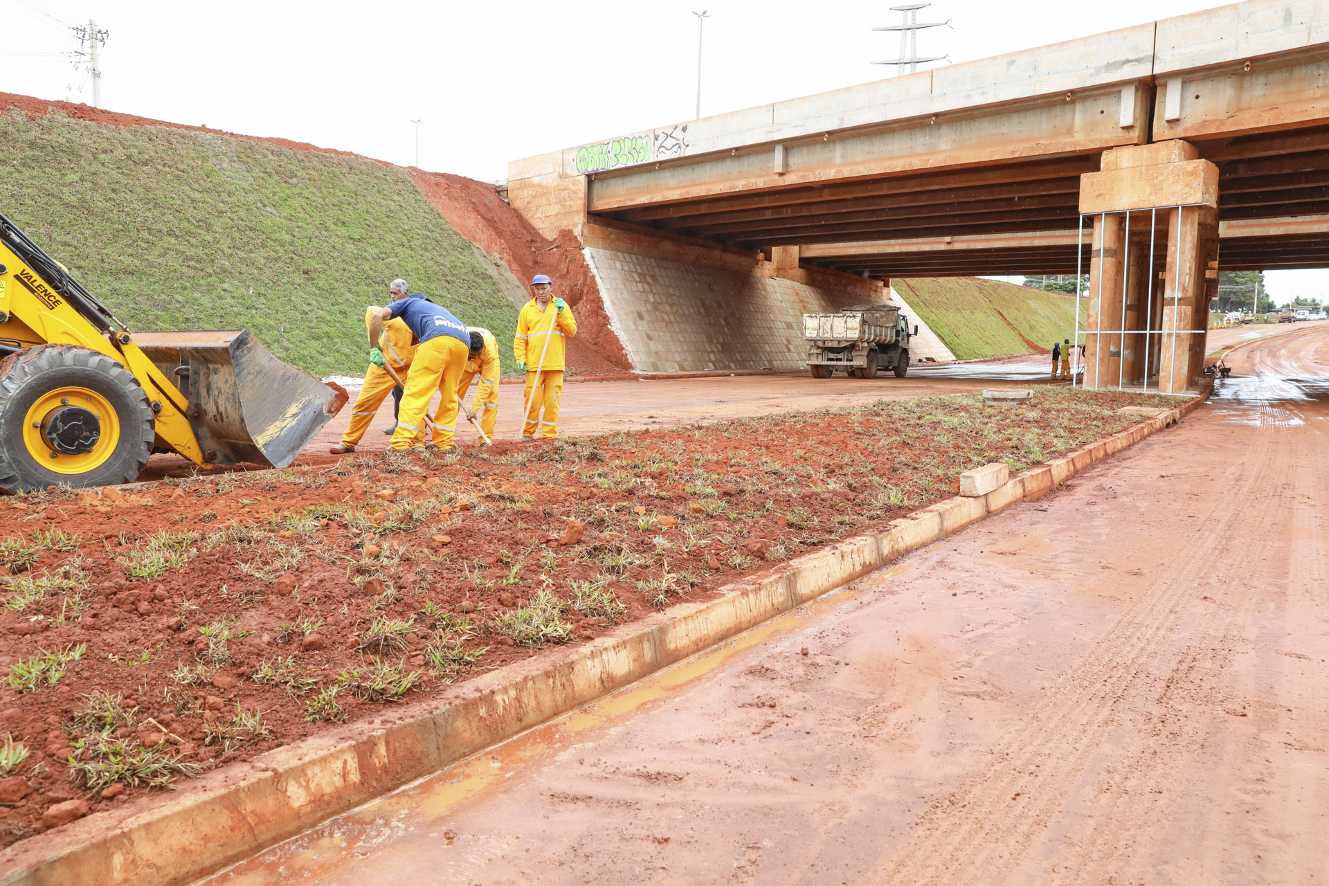 A atual fase da obra é de conclusão das calhas de drenagem superficial e no plantio de grama nos taludes que margeiam as pistas de rolamento