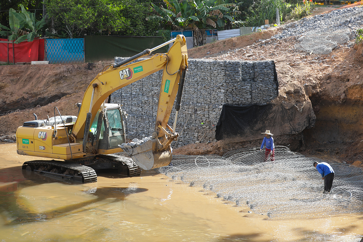 Os gabiões são grandes estruturas de arame recoberto com PVC, que são montados manualmente de forma semelhante a caixas. Cada um é preenchido por pedras e, em seguida, são enfileirados um em cima do outro. Já o alargamento do leito é feito com apoio de maquinário, para manter o volume de água dentro dos limites do córrego mesmo em caso de chuvas intensas.