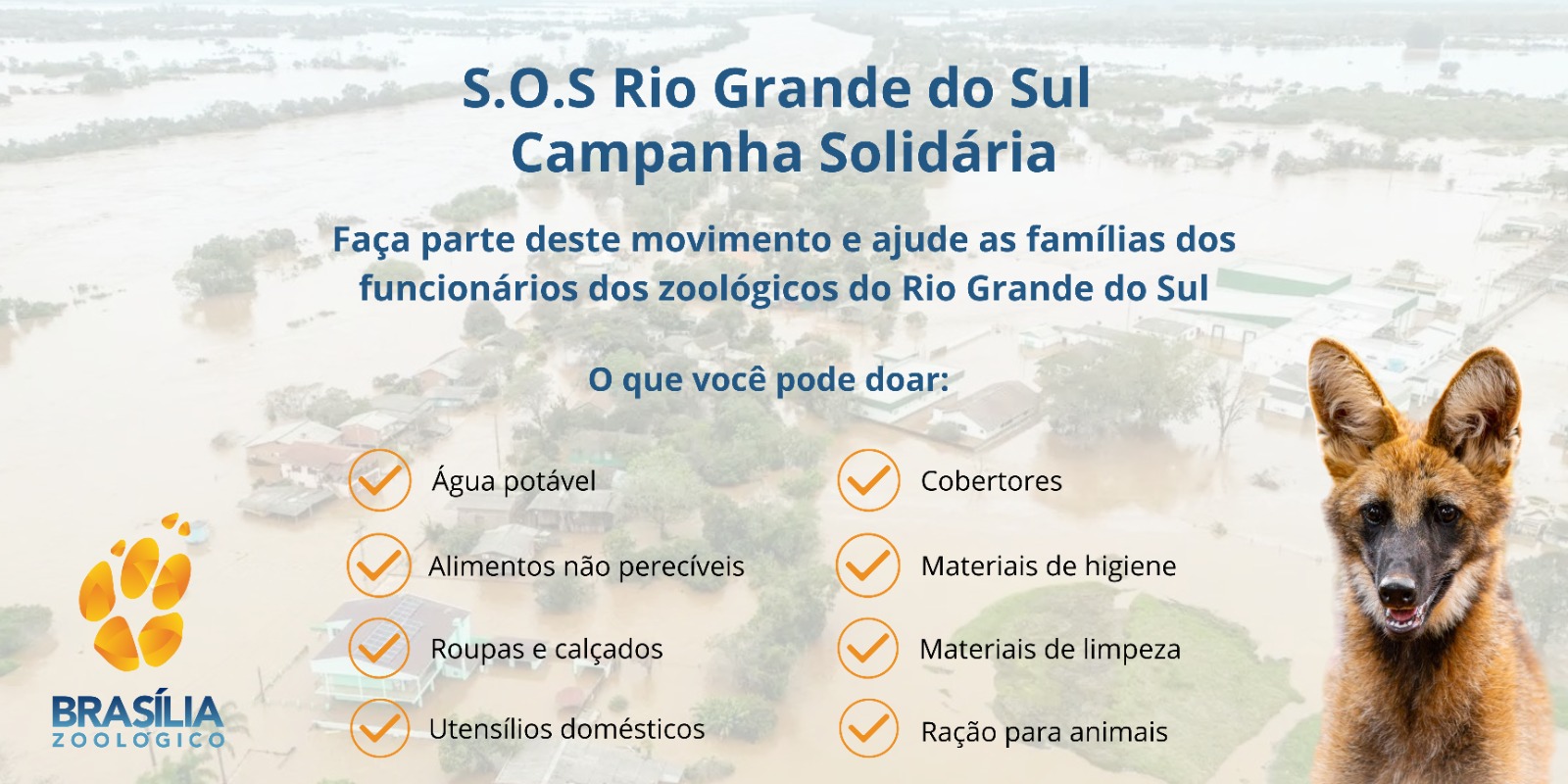 “O Zoológico de Brasília se solidariza com a situação que está acontecendo no Rio Grande do Sul. Por isso, a partir desta terça, nós seremos um ponto de coleta de alimentos, roupas, produtos de higiene e tudo que seja para contribuir. Cada gesto de solidariedade conta e faz a diferença nesse momento difícil”, anunciou Couto.