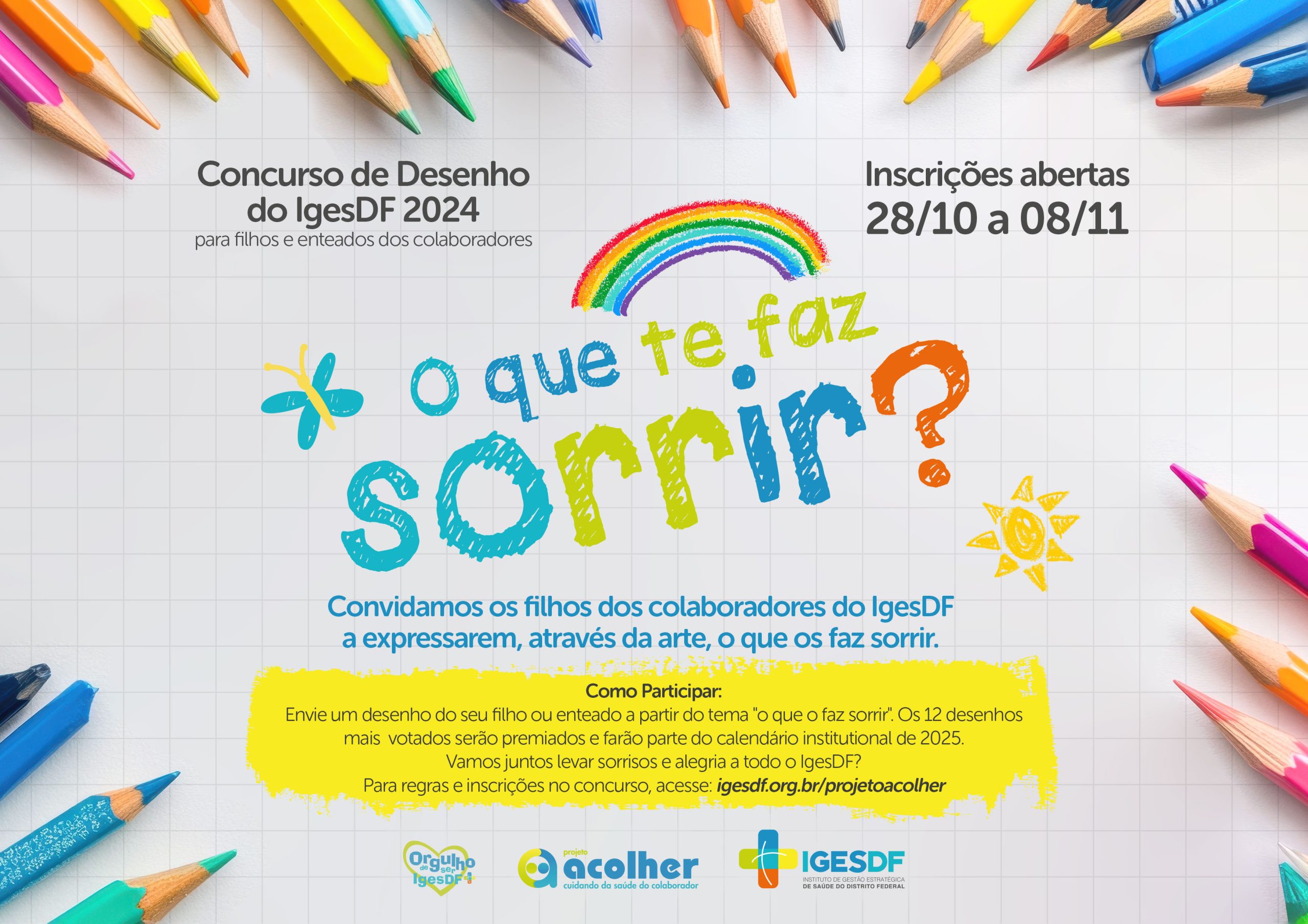 Estão abertas as inscrições para o Concurso de Desenho Infantil promovido pelo Instituto de Gestão Estratégica de Saúde do Distrito Federal (IgesDF). Com o tema “O que te faz sorrir”, o concurso é voltado para filhos e enteados de colaboradores da instituição, que terão a chance de ver suas criações estampando o calendário institucional de 2025. O período de inscrição que vai de 28 de outubro a 8 de novembro, é aberto para crianças entre 5 e 12 anos, e o envio deve ser feito na página do Projeto Acolher no site do instituto.