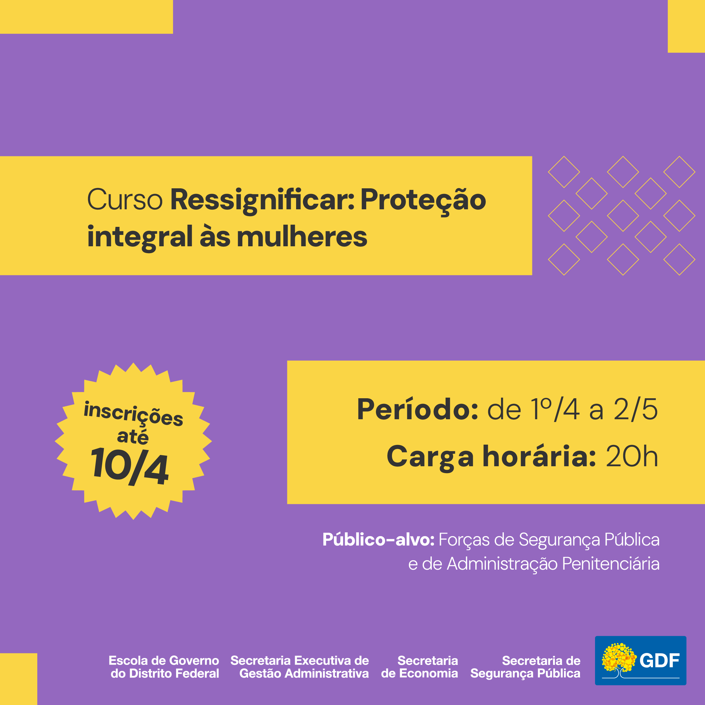 A Escola de Governo do Distrito Federal (Egov) está com inscrições abertas para o curso Ressignificar: proteção integral às mulheres, voltado para capacitar servidores públicos no atendimento especial às vítimas de violência doméstica. Lançada pela Secretaria de Segurança Pública (SSP-DF), a formação visa qualificar profissionais da própria pasta e das forças de segurança, além da Secretaria de Administração Penitenciária (Seape) e da Subsecretaria do Sistema Socioeducativo, vinculada à Secretaria de Justiça e Cidadania (Sejus). A atividade também é extensiva a todos os demais servidores da administração pública que tenham interesse no tema.