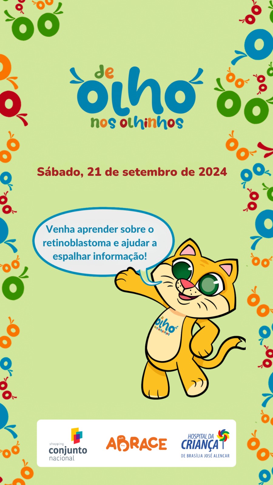 Neste sábado (21), a Associação Brasileira de Assistência às Famílias de Crianças com Câncer e Hemopatias (Abrace) e o HCB realizarão a campanha De Olho nos Olhinhos, uma ação de conscientização sobre a doença, no Shopping Conjunto Nacional, a partir das 11h. Médicos e alunos de medicina das Ligas Acadêmicas de Oncologia Pediátrica participarão distribuindo material informativo e conversando com o público sobre o câncer ocular. Também haverá atividades para as crianças.