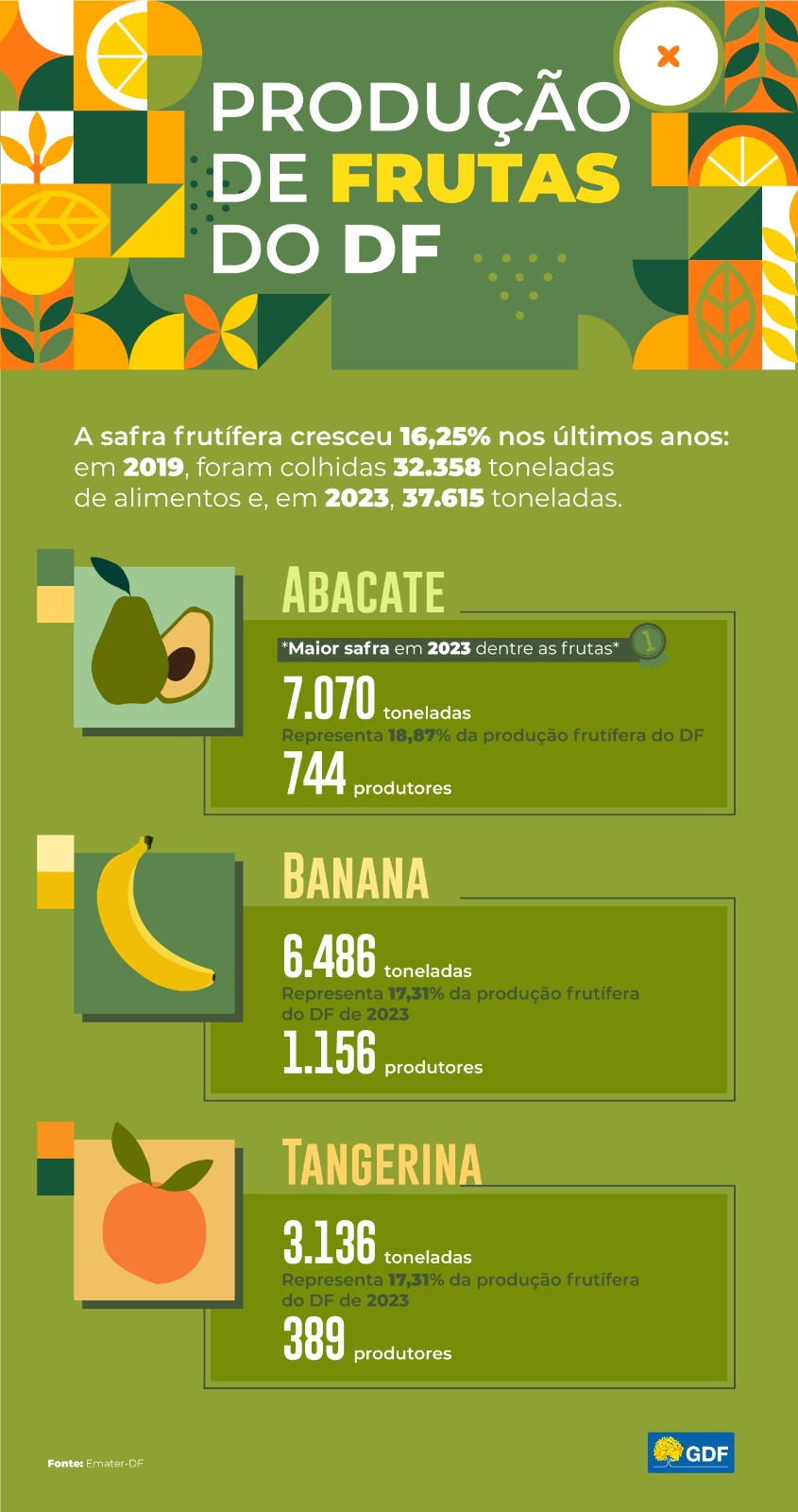Abacate, banana e tangerina são as culturas que apresentaram maior aumento na produção em 2023. A safra do abacate cresceu 21,88% em comparação à de 2021, alcançando 412 hectares plantados e 7.070 toneladas colhidas – equivalente a cerca de 19% da produção total de frutas do DF. Ricos em potássio e nas vitaminas A e C, o alimento é encontrado em 744 propriedades rurais, sendo que a maioria está em Sobradinho, em Brazlândia e no Núcleo Rural Alexandre Gusmão.