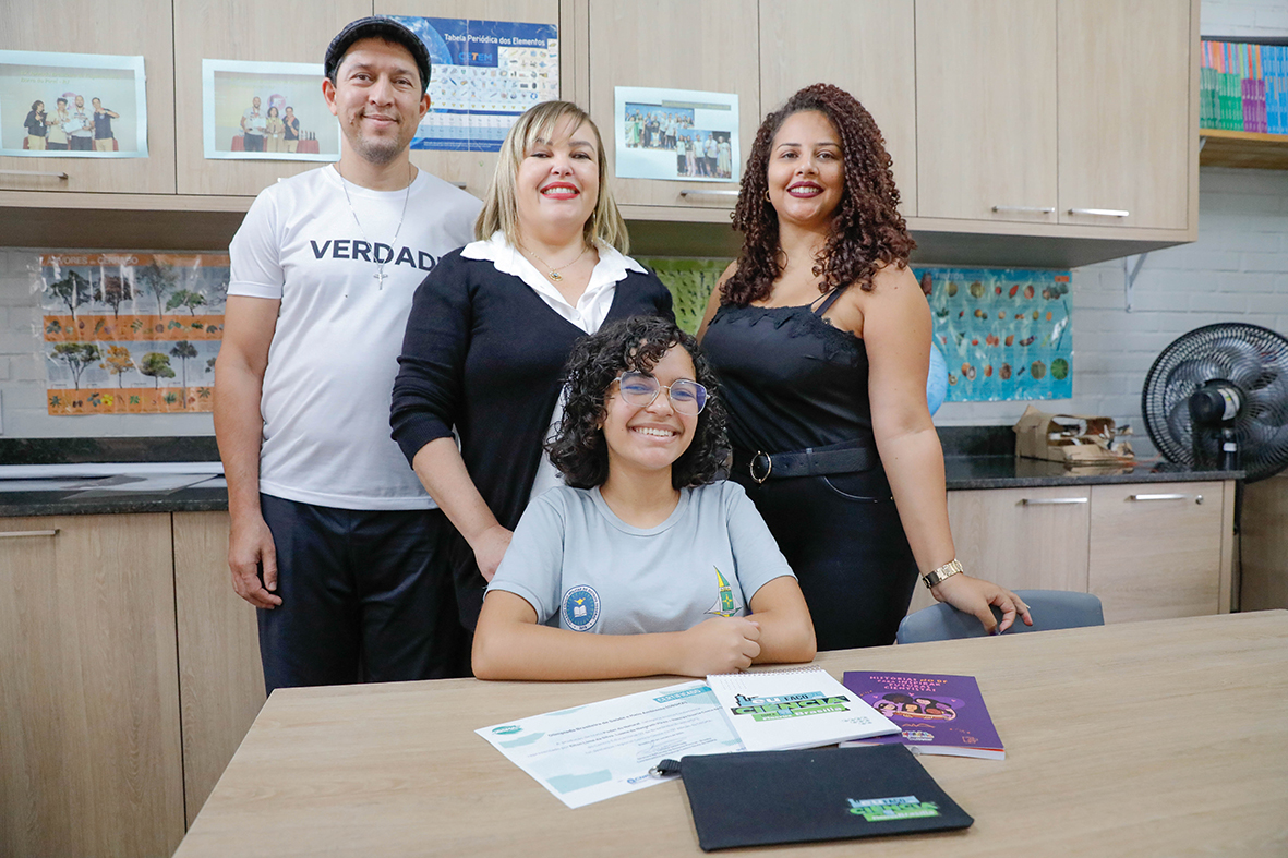 A professora Luana Nazareth (terceira de pé, com o professor Elton da Silva e a mãe de Hannya, Neslen Duarte): “Desde o primeiro texto que eu li da Hannya, falei que ela tinha potencial e que precisava investir nisso”