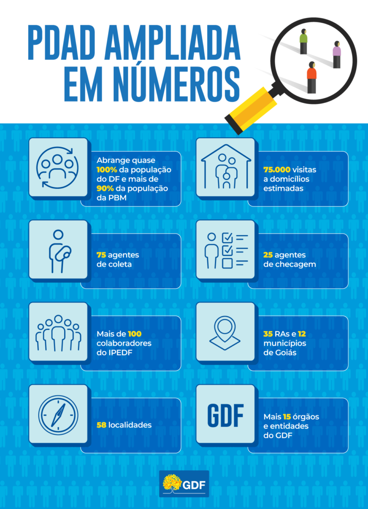 A partir de novembro, os agentes de coleta farão visitas às residências do Distrito Federal e do Entorno para extrair informações da população e da infraestrutura das 35 regiões administrativas da capital e de 12 municípios goianos que integram a Região Integrada de Desenvolvimento do Distrito Federal (Ride). Serão de quatro a seis meses em campo para mapear o perfil socioeconômico a ser publicado na Pesquisa Distrital por Amostra de Domicílios Ampliada (Pdad-A). A meta é visitar 25 mil domicílios que gerarão informações para representar um universo de mais de 1 milhão de residências.